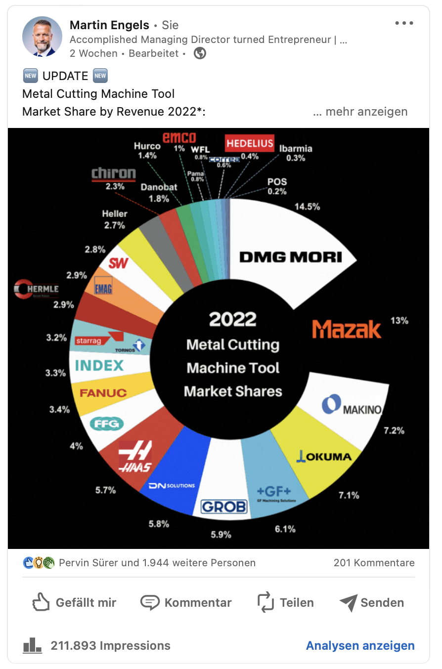 Mit meinen Beiträgen und Artikeln zu den Themen Maschinenbau, Werzeugmaschinen, B2B-Sales und -Marketing und interessanten Einblicken zu Marktanteilen sowie Marktzahlen verfüge ich über ein großes Netzwerk auf Linkedin. Mit über 5.000 Followern gehört mein LinkedIn Profil zu einem der stärksten im Bereich der metallzerspanenden Werkzeugmaschinenindustrie.